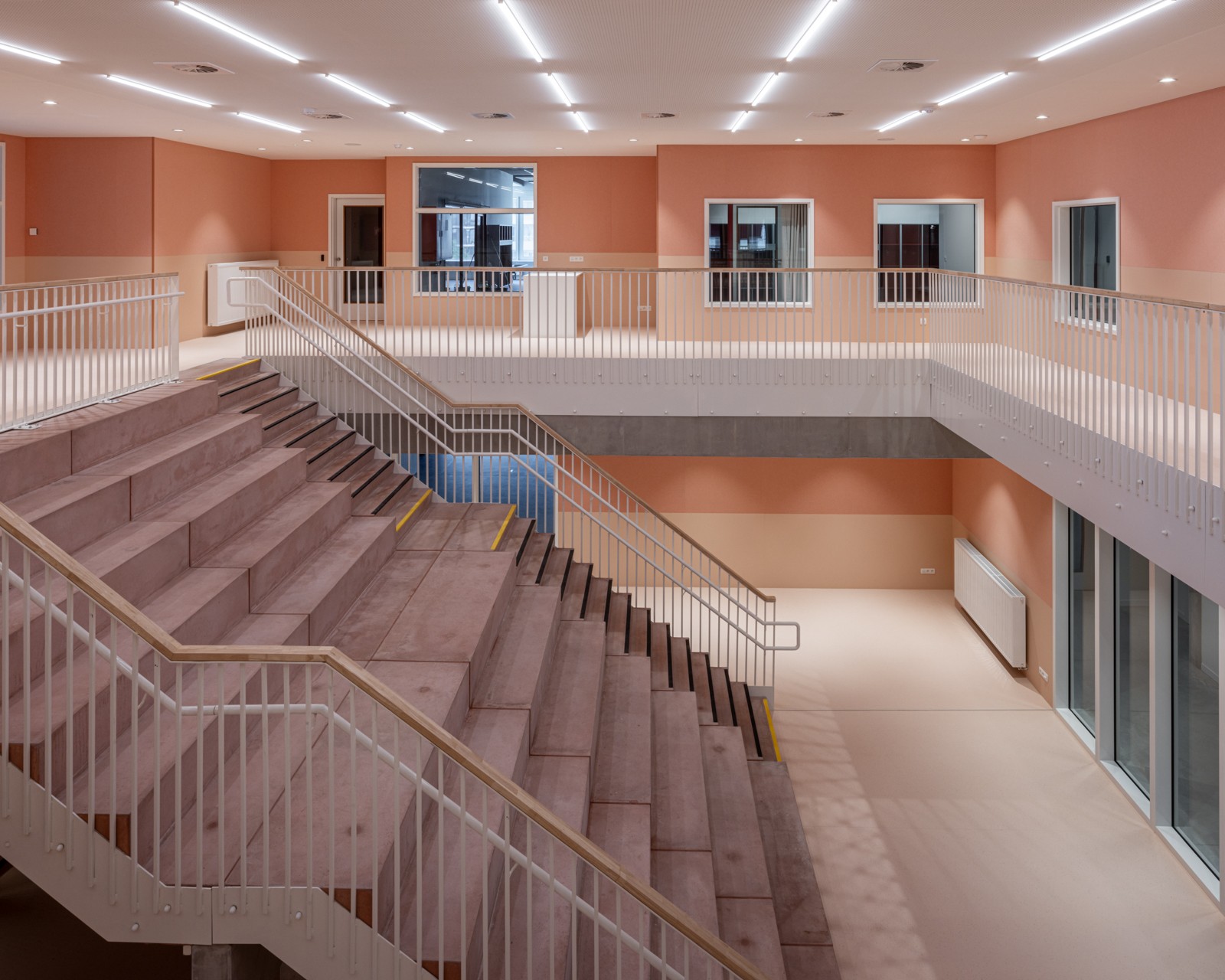 De twee scholen staan schouder aan schouder, compact gestapeld op een gelijkvloerse plint met alle gemeenschappelijke functies. Elke school krijgt een duplexopstelling rond de centrale en gedeelde learning street die werd uitgewerkt als het hart van de scholen. De derde bouwlaag bevat de kleine turnzaal en de overdekte speelplaats. Op het hoogste niveau wordt de grote sporthal geplaatst. De speelplaatsen zijn met zorg uitgewerkt. Aan de zuidzijde zorgt een cascade van verschillende speelpleinen voor ruimtelijke openheid, van een grote overdekte stoere speelplaats op niveau drie naar rustigere en groene speeltuinen op het maaiveld.