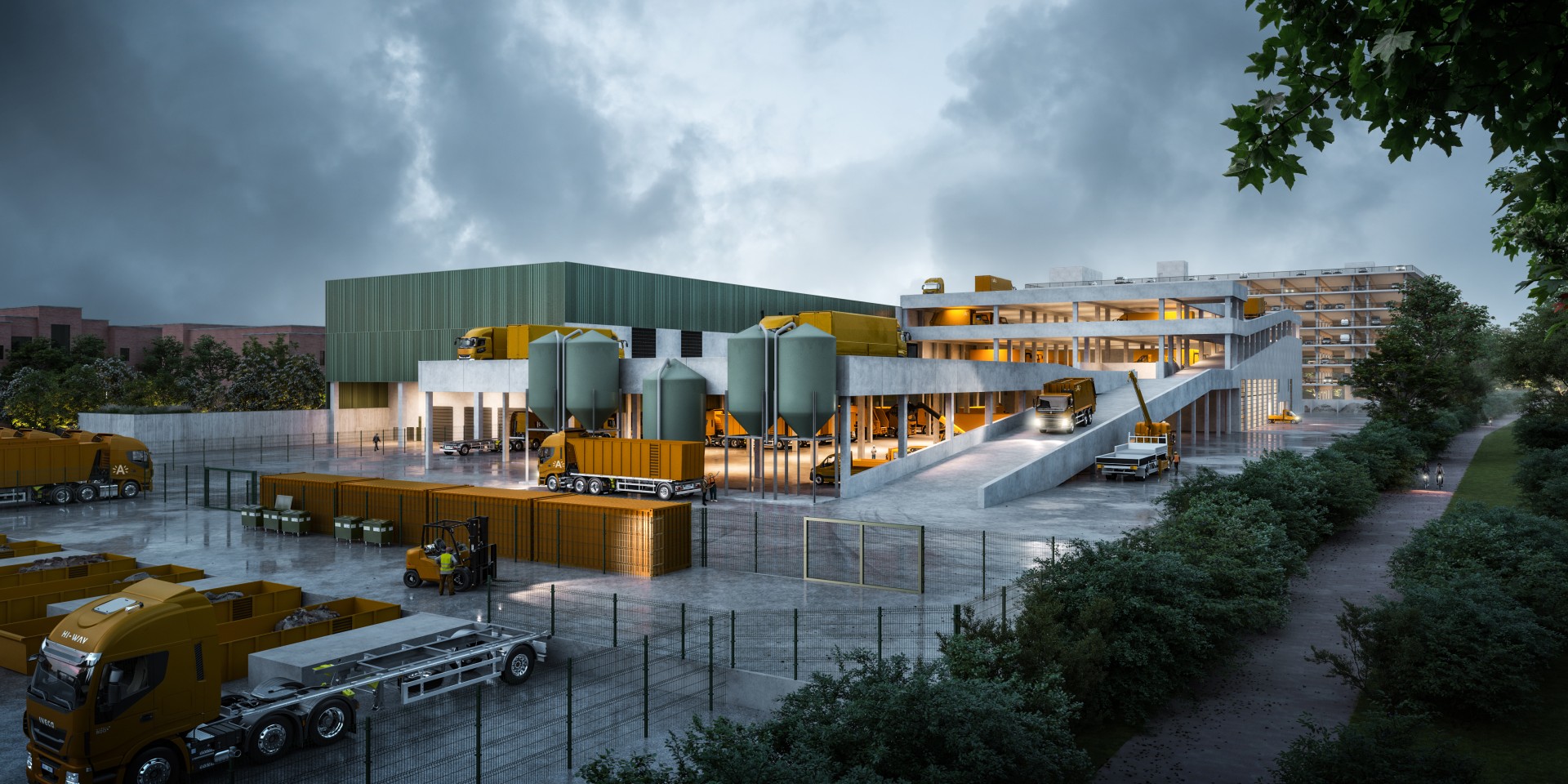 - bestaat uit een voertuigencentrum, parking, opslagruimte binnen en buiten, kantoren, kleedruimtes en andere ondersteunende functies.