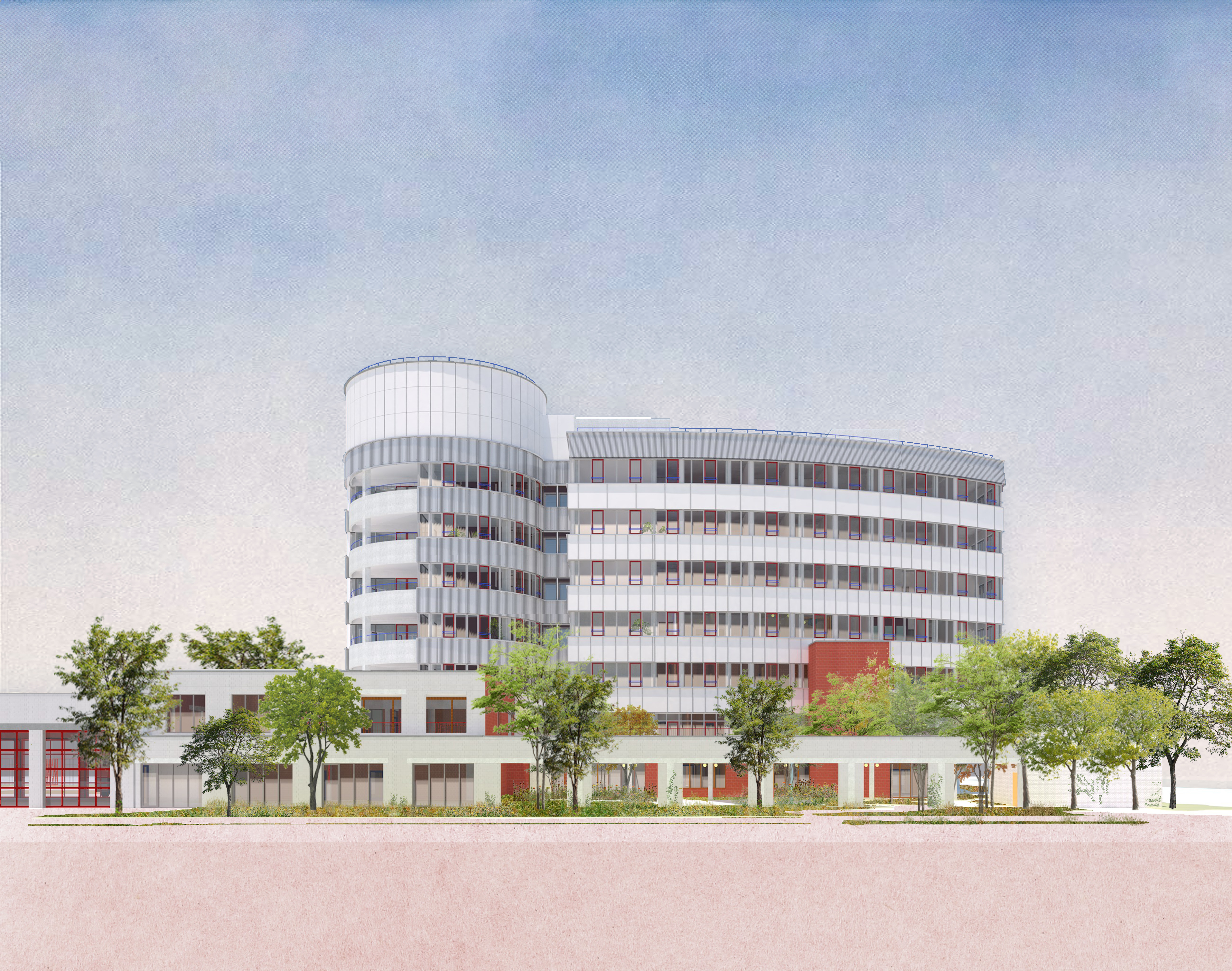 Een nieuwe brandweerkazerne en daklozenopvang worden ondergebracht in een bestaand kantoorgebouw met toren aan de Generaal Armstrongweg/Emiel Vloorsstraat.